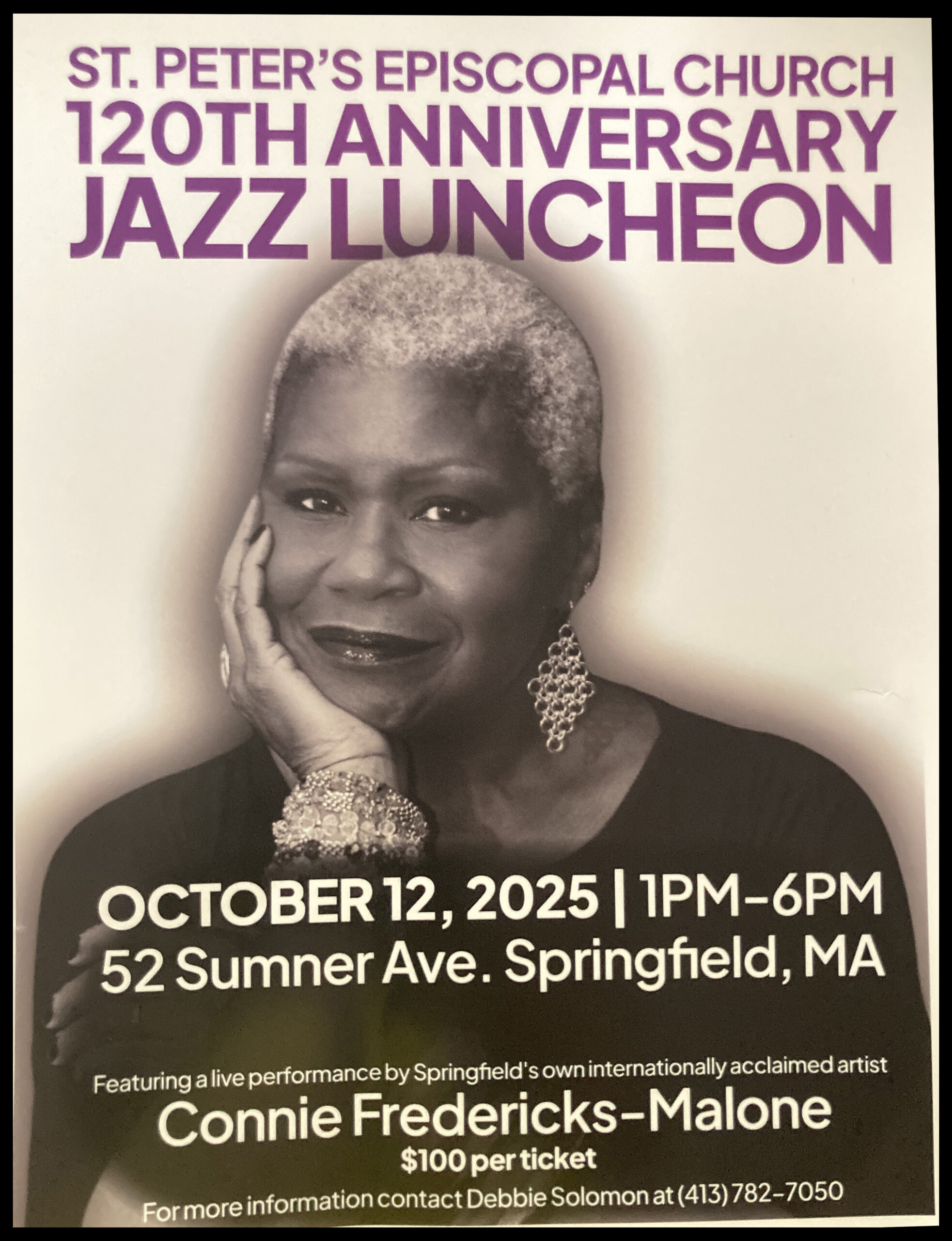 Welcome to the 120th Anniversary Jazz Luncheon! Come join us at 52 Sumner (Springfield Performing Arts Ventures, Inc.) on October 12, 2025 at 1:00 PM for a delightful afternoon filled with jazz music, delicious food, raffles, door prizes, and more. Get ready to enjoy a live performance from Springfield's own and Internationally acclaimed artist Connie Fredericks-Malone. Don't […]