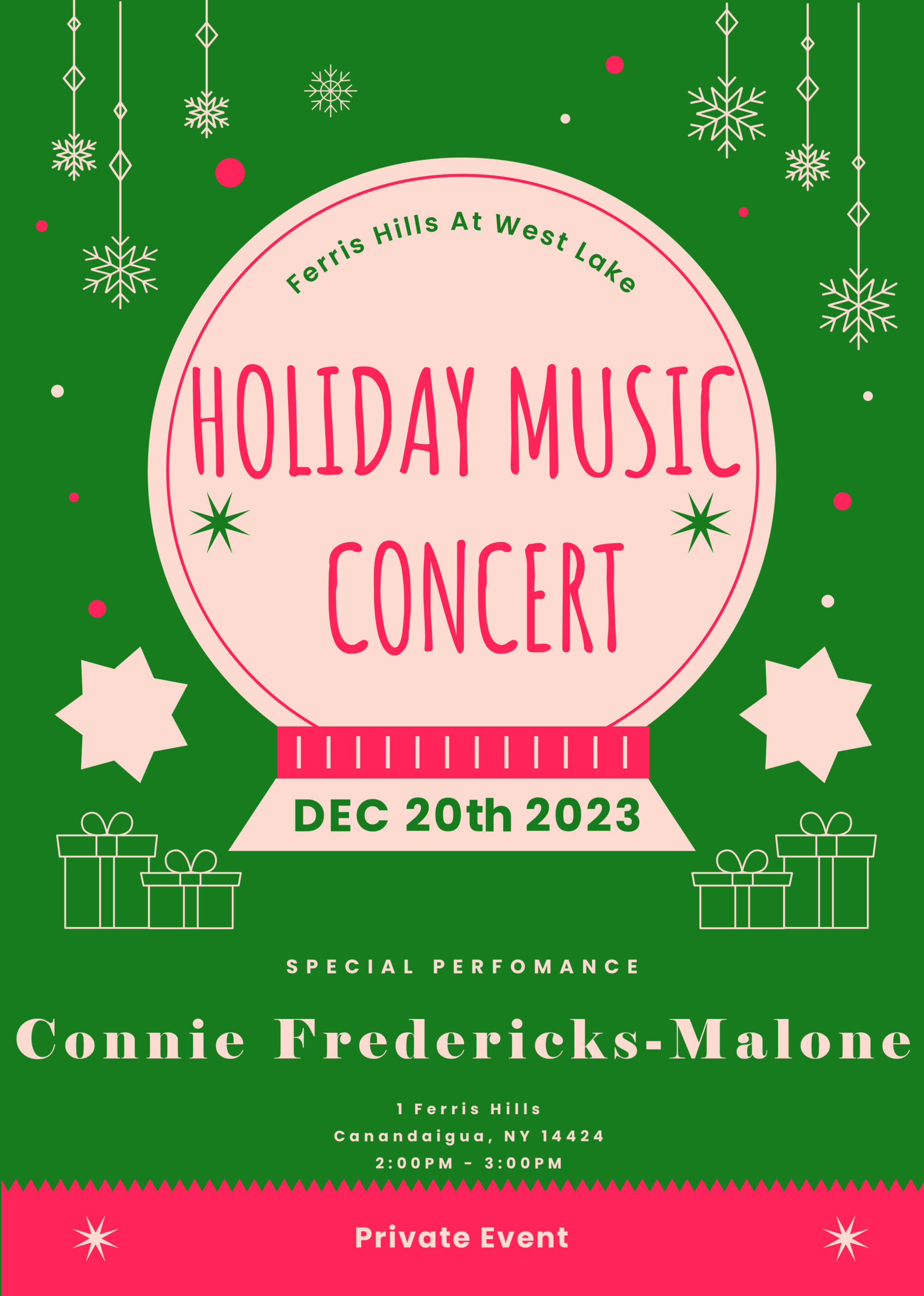 December 20, 2023 @ 2:00 pm - 3:00 pm Holiday Music Concert Ferris Hills At West Lake 1 Ferris Hills, Canandaigua, NY, United States